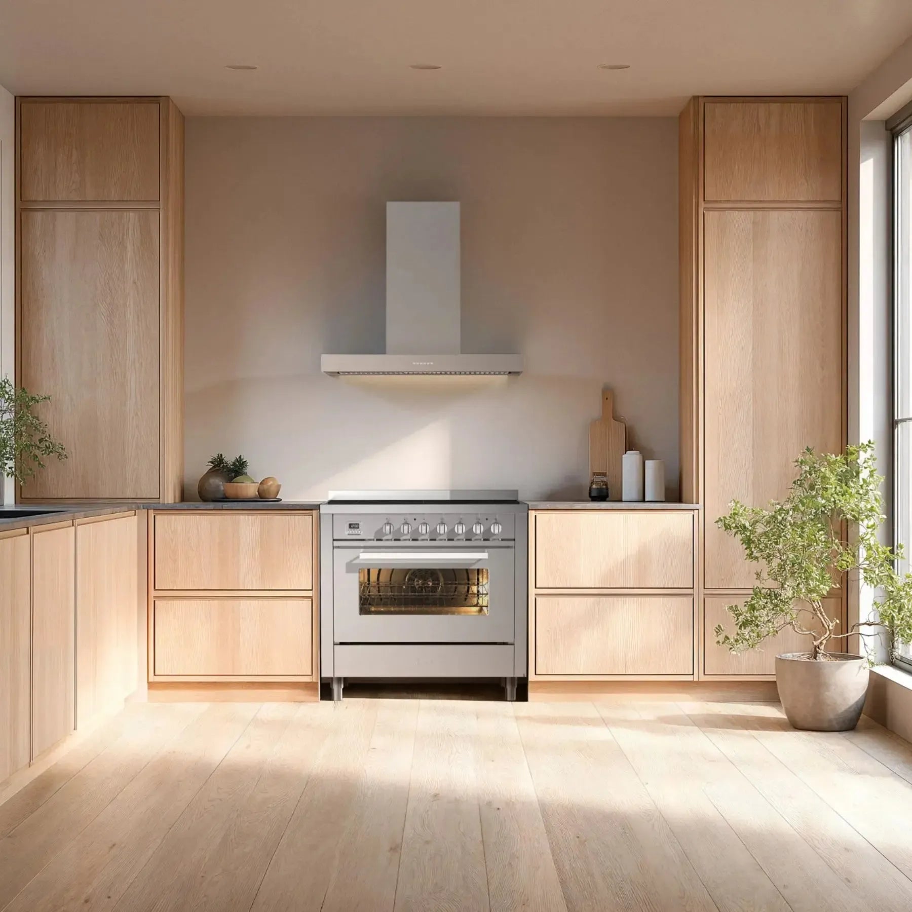 ILVE Pro Line 90 cm med 5 induktionszoner leverer effektiv varme og finfølende styring. Den store multifunktionsovn og den praktiske opbevaringsskuffe giver plads og overblik i hverdagen.