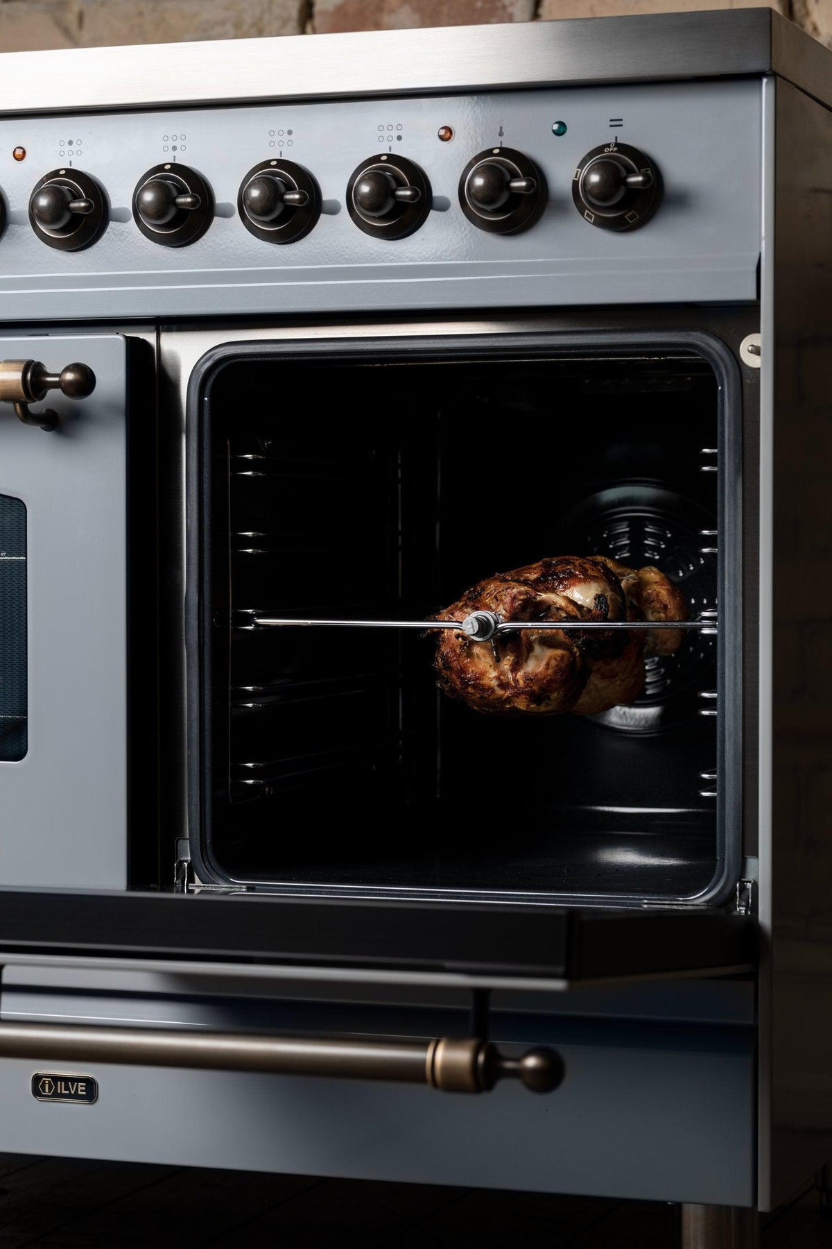 Plads til det hele har du også nedenunder, hvor iLVE Nostalgie er udstyret med to elektriske ovne. Den store ovn har en bredde på 80 centimeter og en kapacitet på 97 liter, praktisk non-stick-emaljering og en lang række funktioner, du bliver glad for. Ovnen har børnesikring, og ovndøren har tre lag glas, så den føles kølig udenpå, selv når ovnen arbejder ved højeste temperatur. Termostaten styres elektronisk med intervaller af 5 grader, så du kan ovnstege med præcision helt op til 300 grader. De høje varmegrader giver dig en fordel, når du skal have flot skorpe på dit surdejsbrød eller sprød bund på pizzaen. iLVE Nostalgie har også ’steam discharge’-funktion, som lukker damp ud af ovnen, hvilket hjælper dig til sprødt skind på kyllingen, som i øvrigt kan steges på ovnens rotisserie-spyd. Ovnen er desuden designet til at kunne rumme de såkaldte ’gastrobakker’, som bruges i professionelle køkkener. Det giver dig en pladsbesparende fordel, når du skal lave mad til mange.
