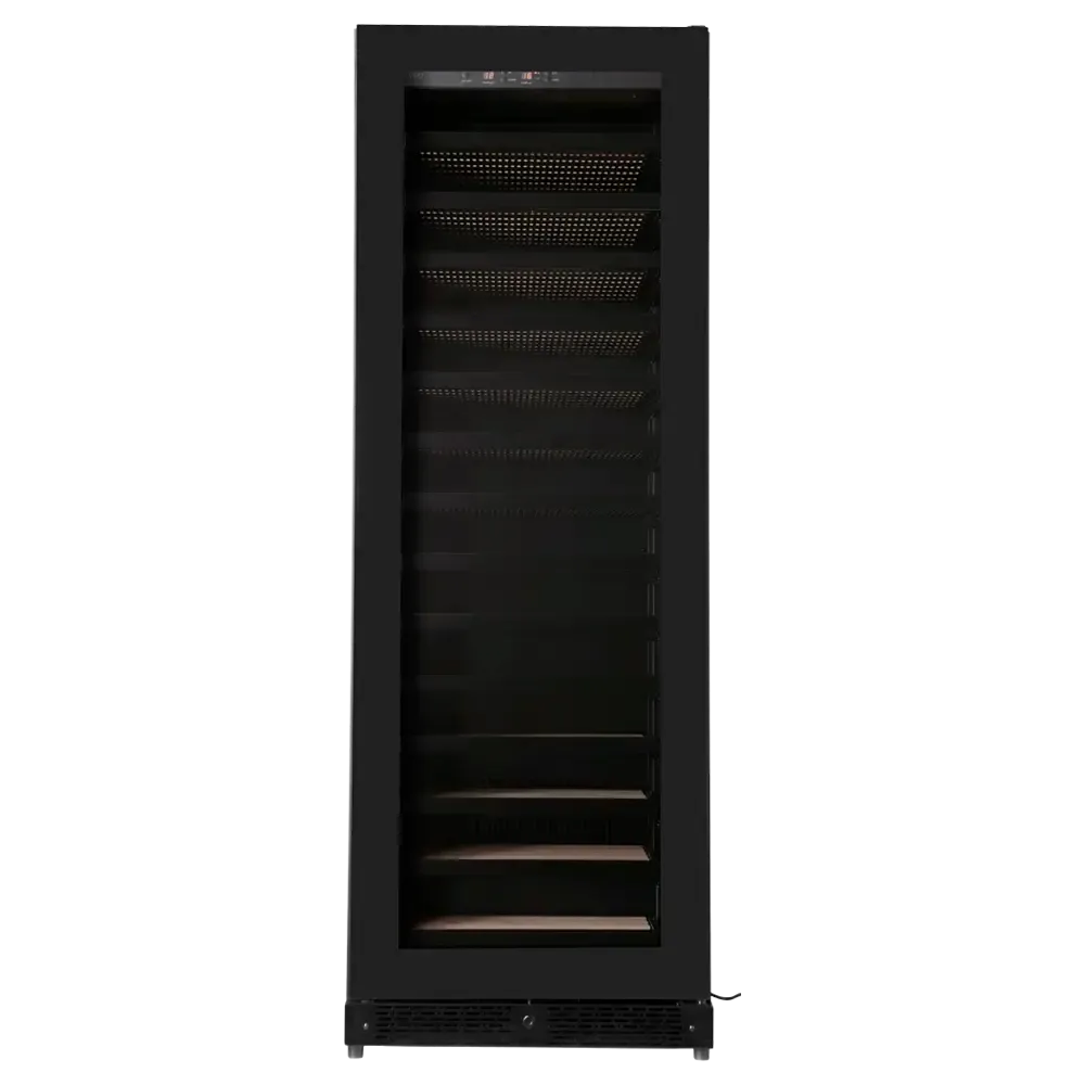 Den matsorte stålfront kombineret med energivenligt LOW-E glas giver køleskabet et elegant og tidløst udtryk, der passer perfekt i både moderne køkkener og vinkældre. Flaskerne placeres på fuldt udtrækkelige hylder i bøgetræ, som kan vælges med trim i træ, sort aluminium eller rustfrit stål. LED-belysning i hvid, blå eller orange fremhæver din samling, når døren åbnes.