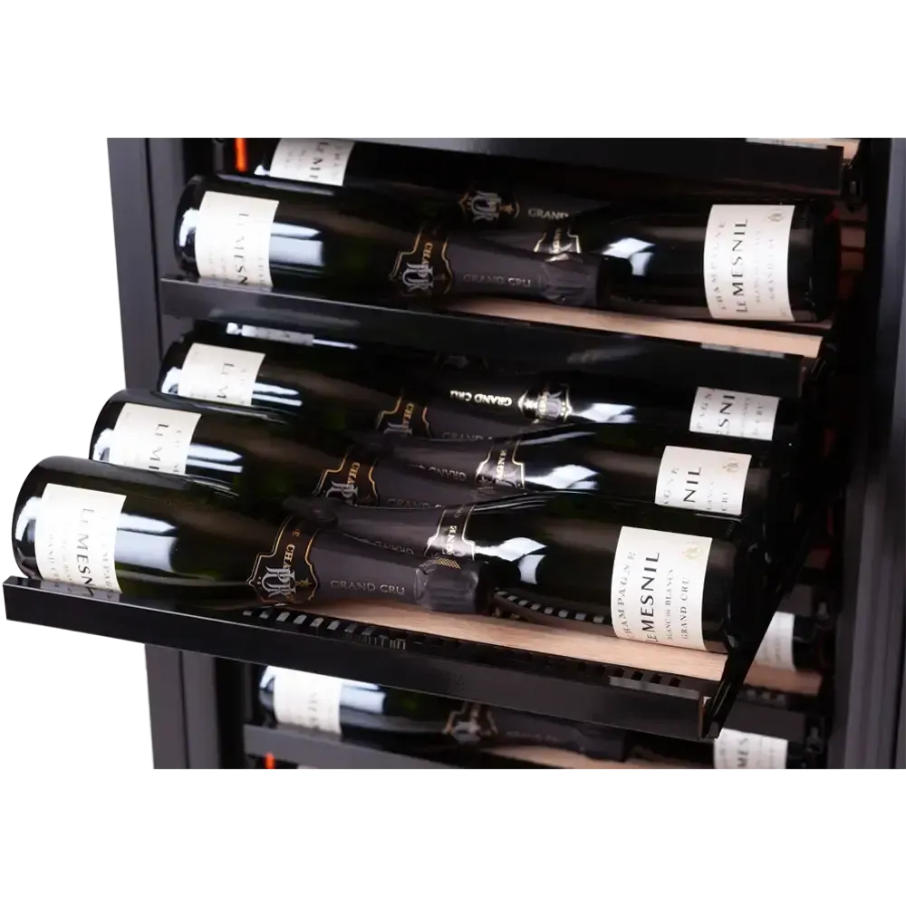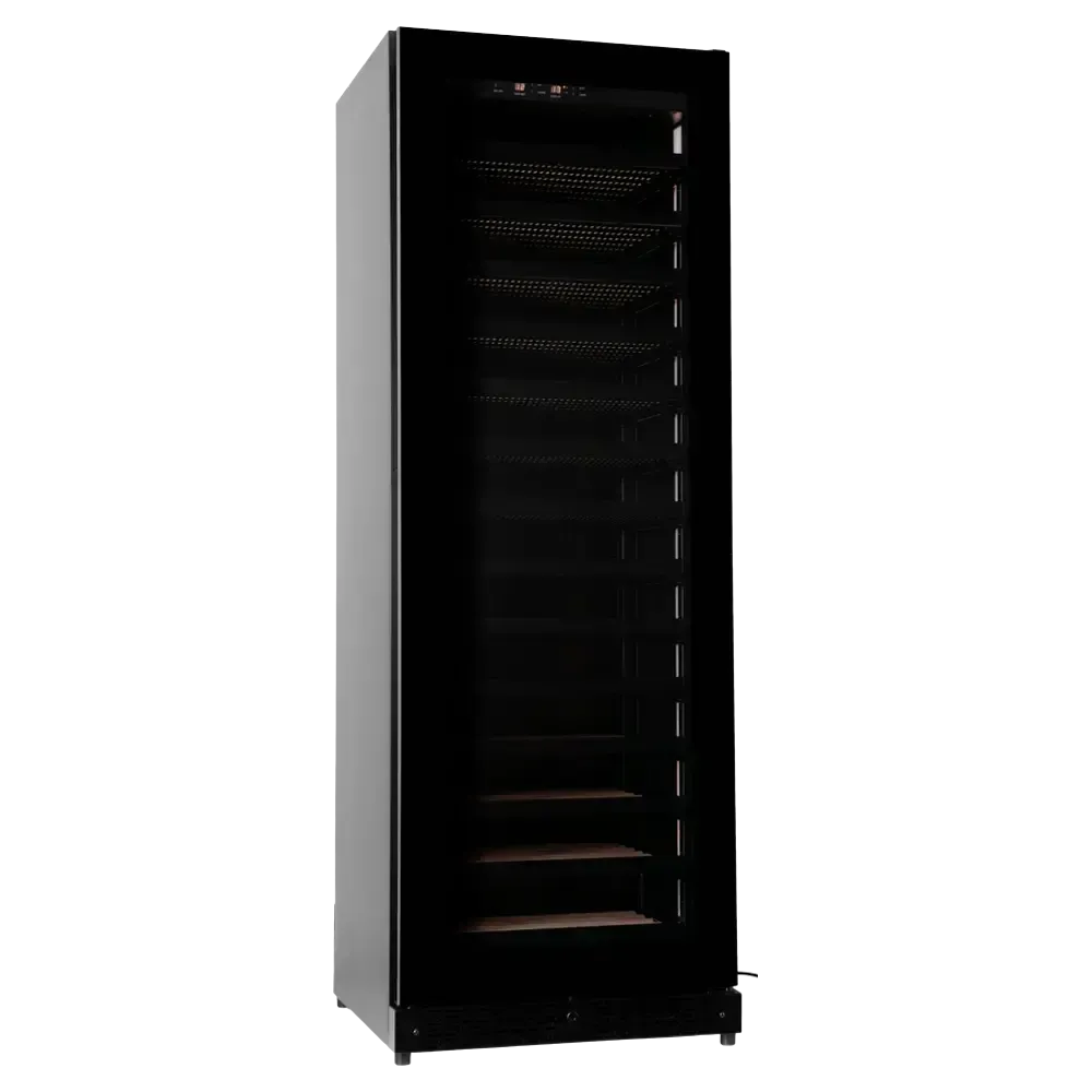 Den matsorte stålfront kombineret med energivenligt LOW-E glas giver køleskabet et elegant og tidløst udtryk, der passer perfekt i både moderne køkkener og vinkældre. Flaskerne placeres på fuldt udtrækkelige hylder i bøgetræ, som kan vælges med trim i træ, sort aluminium eller rustfrit stål. LED-belysning i hvid, blå eller orange fremhæver din samling, når døren åbnes.