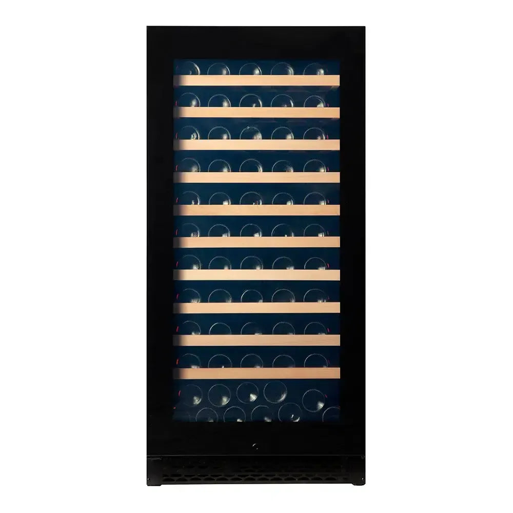 Flaskerne placeres på fuldt udtrækkelige hylder i bøgetræ, som kan tilpasses med trim i træ, sort aluminium eller rustfrit stål. Elegant LED-belysning i hvid, blå eller orange giver en smuk præsentation af samlingen, når døren åbnes.