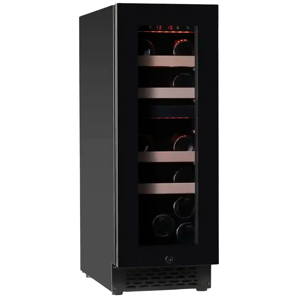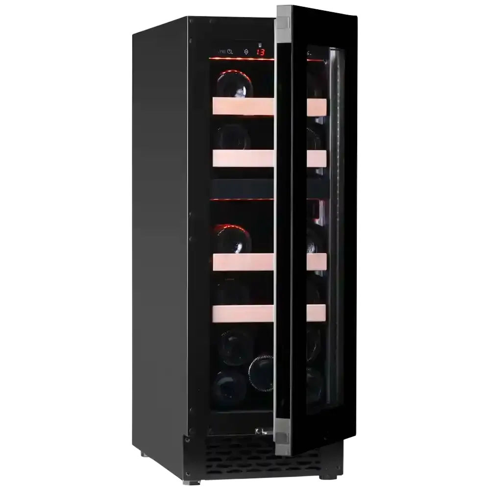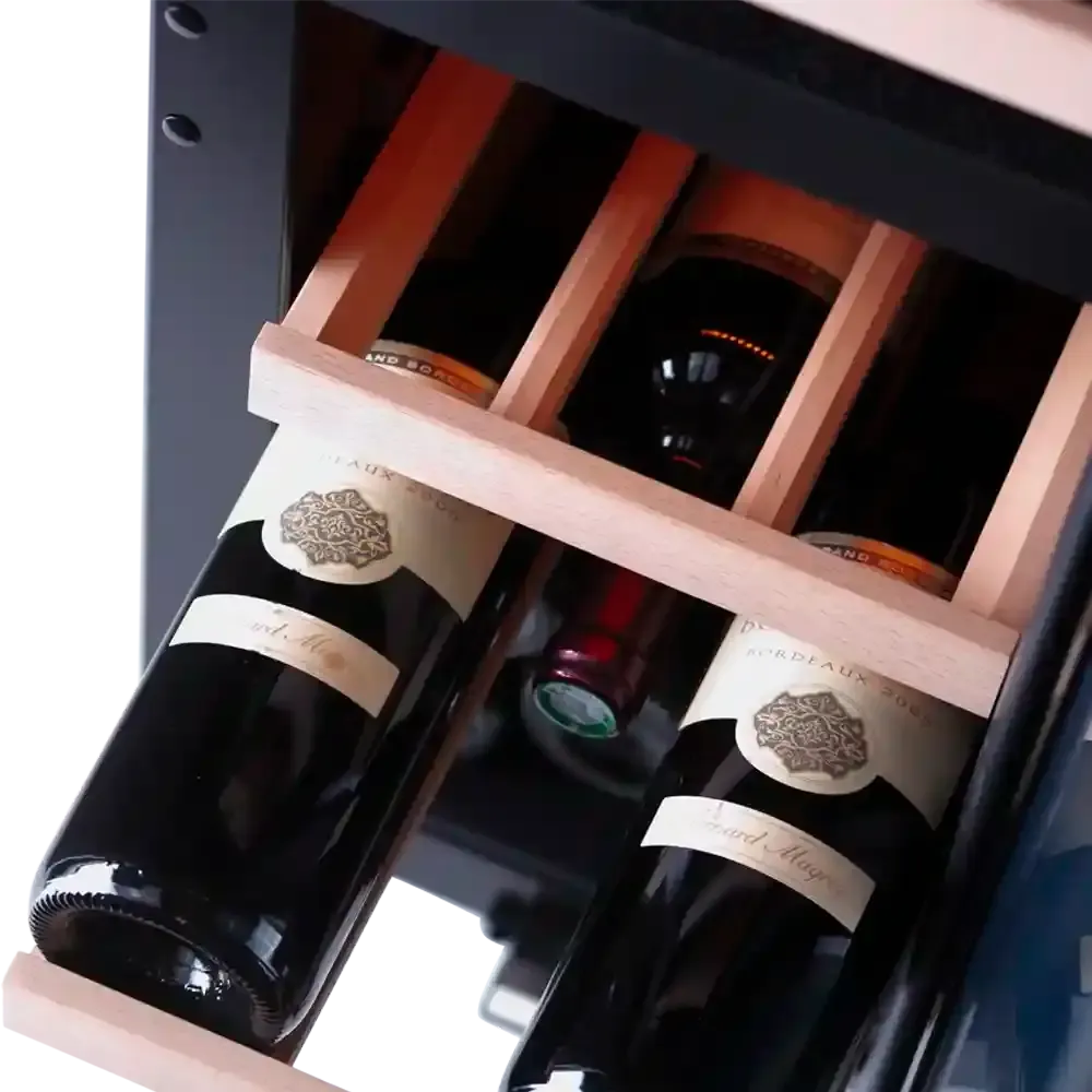 Køleskabet rummer op til 17 Bordeaux-flasker, som placeres på fuldt udtrækkelige hylder i bøgetræ. Hylderne kan tilpasses med trim i træ, sort aluminium eller rustfrit stål. Indvendig LED-belysning i hvid, blå eller orange giver en flot præsentation af din vin, når døren åbnes.