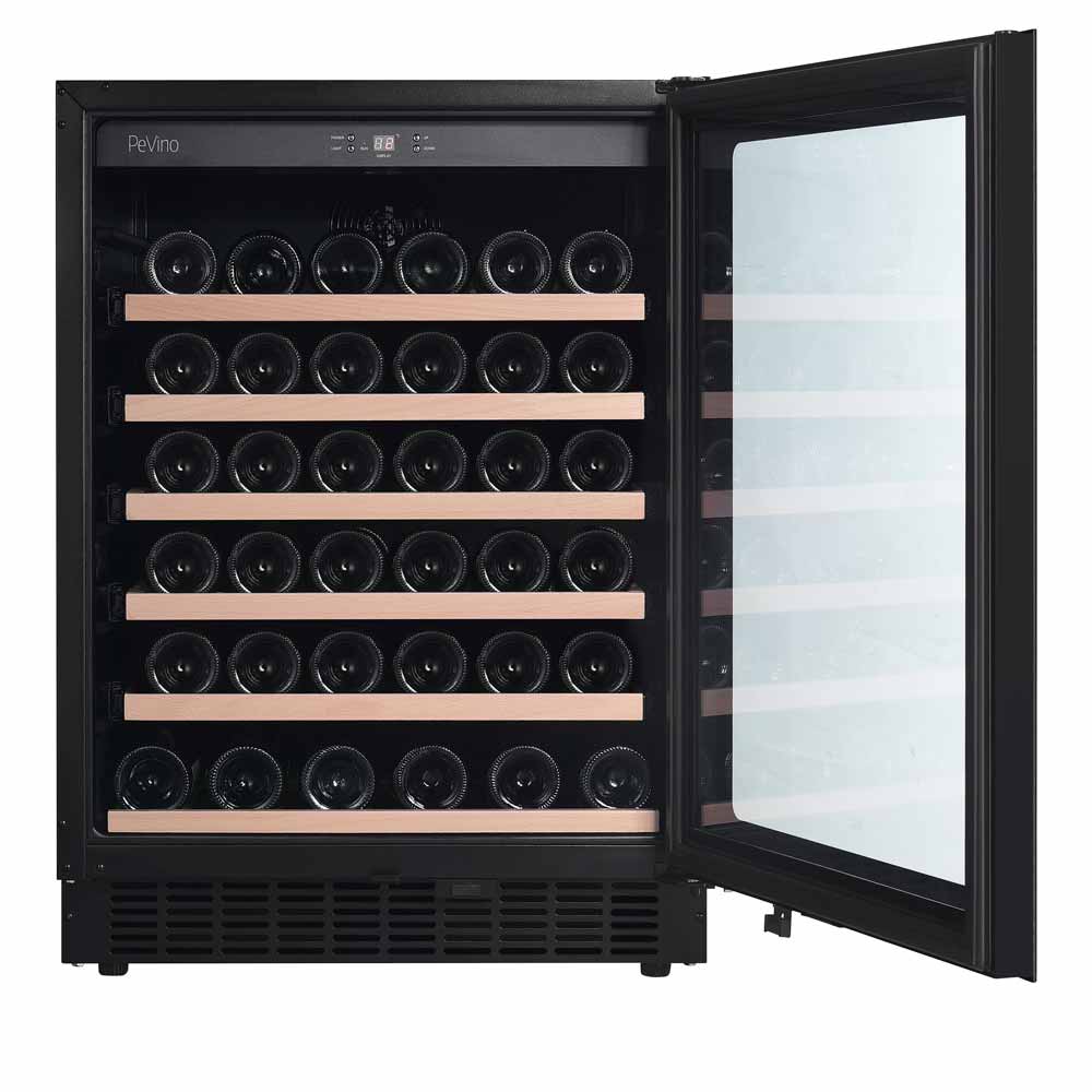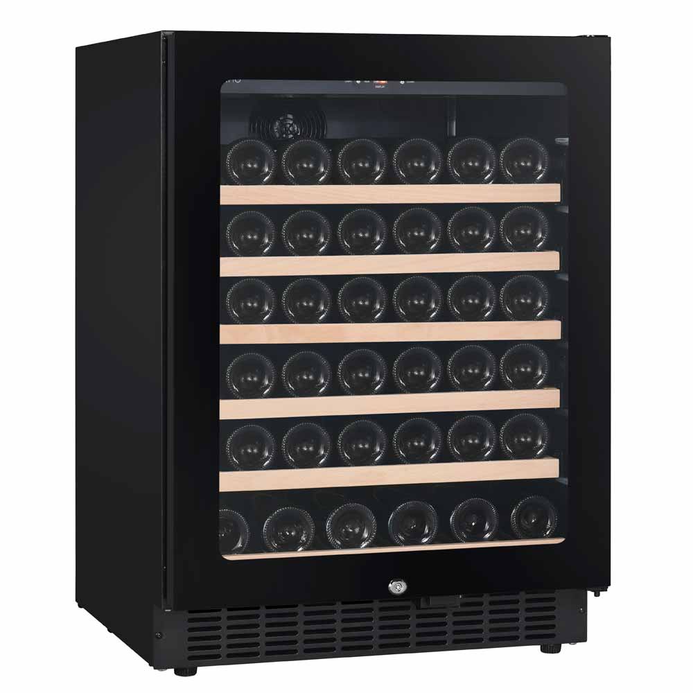 Flaskerne hviler på fuldt udtrækkelige hylder i bøgetræ, som fremhæves af et indvendigt LED-lys i hvid, blå eller orange. Den sorte glasfront med energivenligt LOW-E glas giver et moderne udtryk og beskytter samtidig din vin mod lys og temperaturudsving.